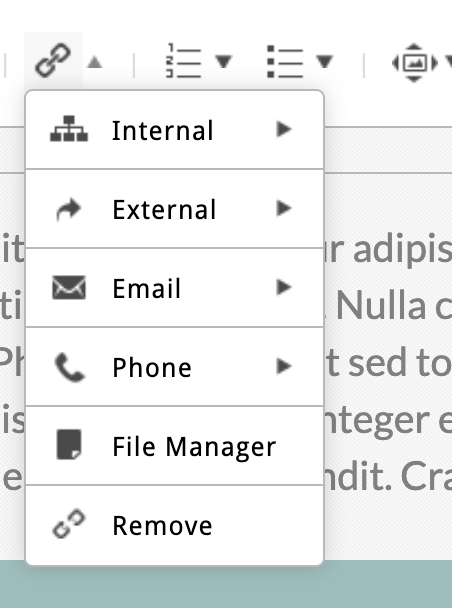 You can turn any piece of text into a clickable link. Just highlight the text, click the Link icon, and choose from one of the following link types: