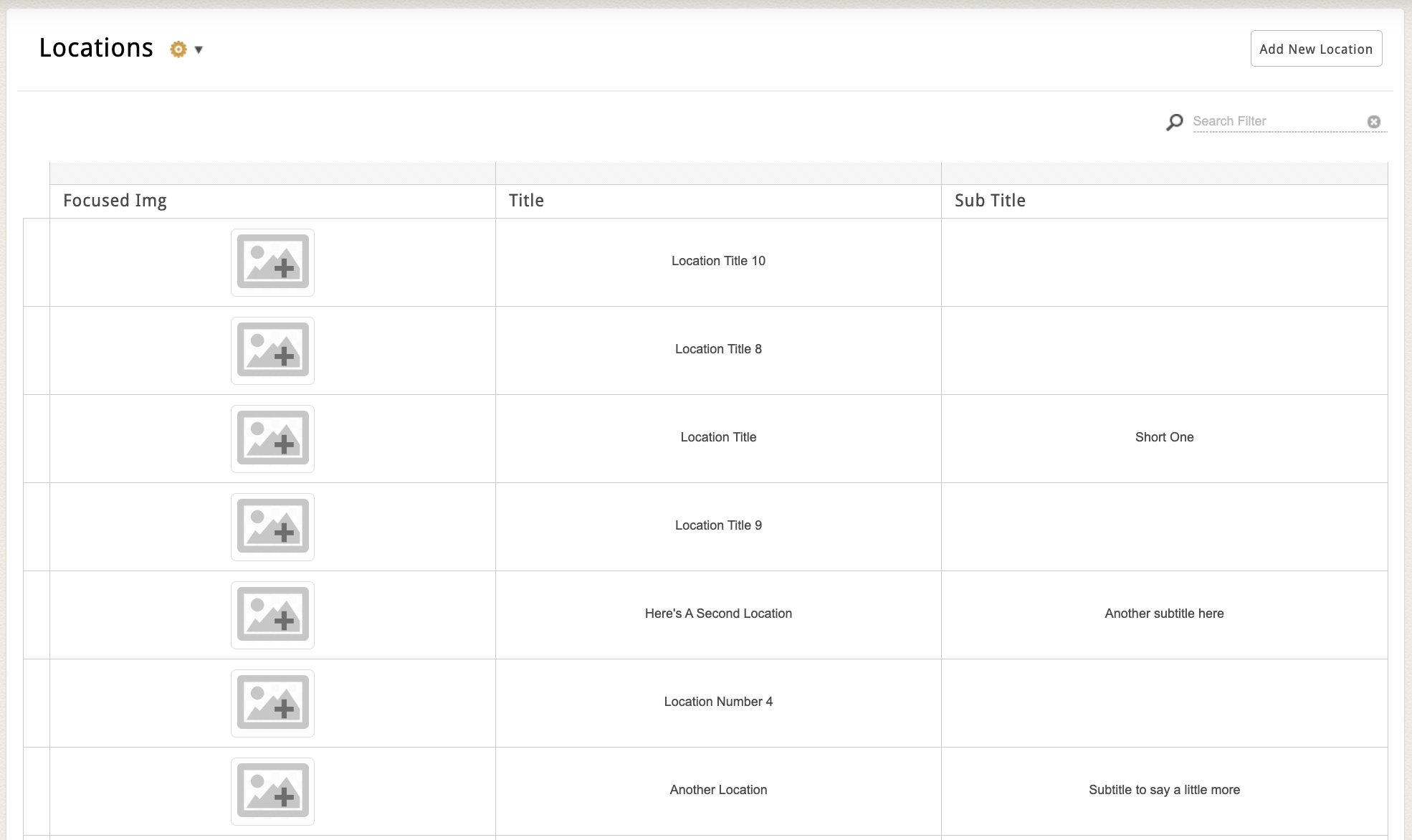 - You’ll typically see a list of location entries in a flex grid. Specific attribute fields for your locations may vary, but common ones include: