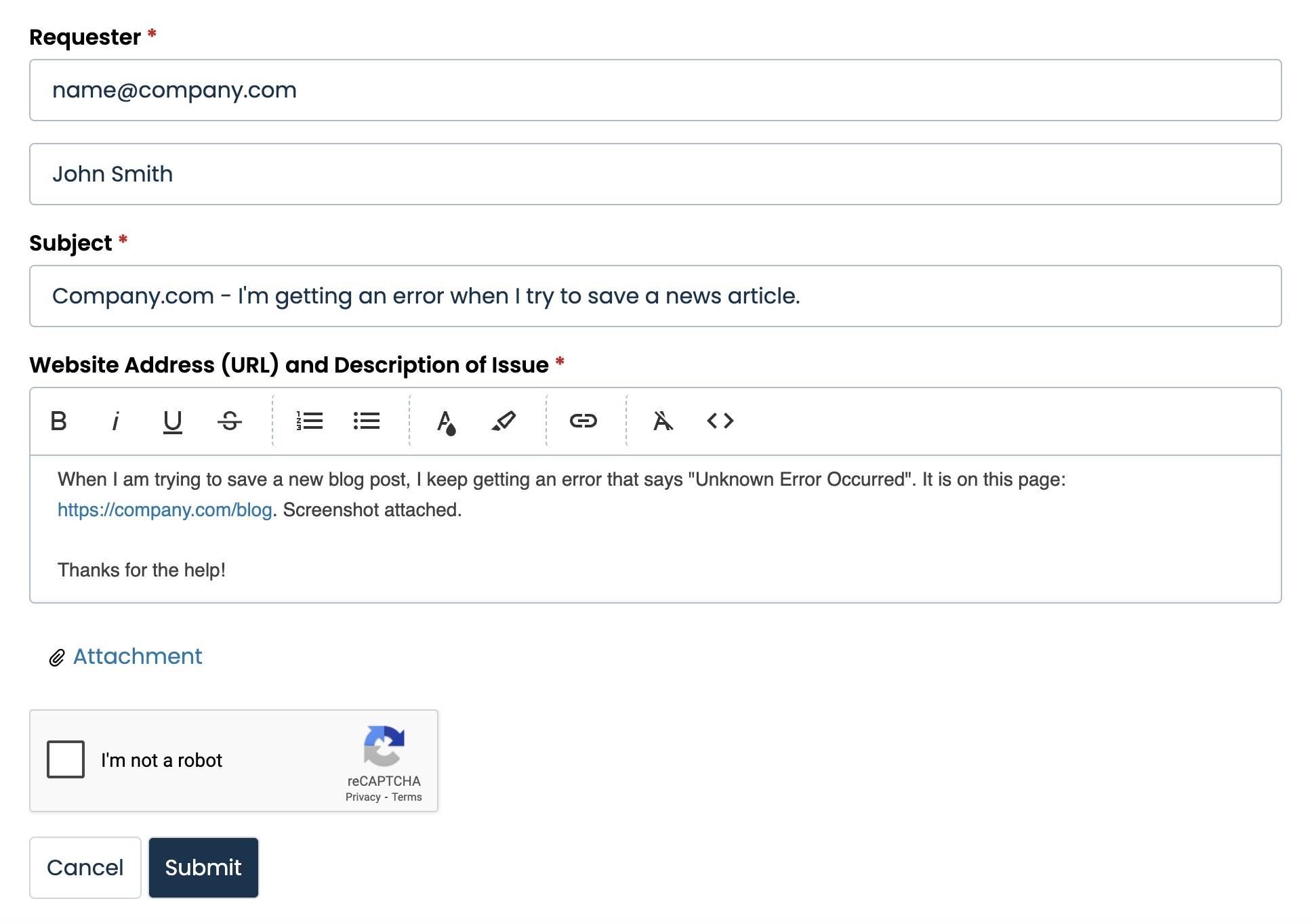 Fill in the details of the issue you're experiencing or change request with as much detail as you can provide. A good rule of thumb includes: